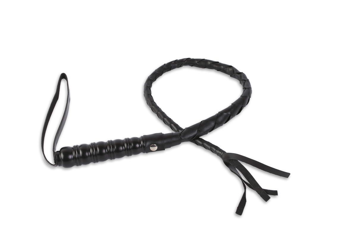 Длинный кнут изготовлен из черного кожзаменителя. Для удобства на нём есть удобная фигурная рукоятка и петля. Длина 97 см |