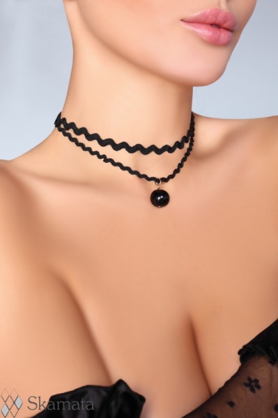 Тесьма шириной 5 мл и 3 мл, длина широкой тесьмы 30 см, на тонкой тесьме подвеска из искусственного камня. Застежка металл, длина цепочки 5 см.