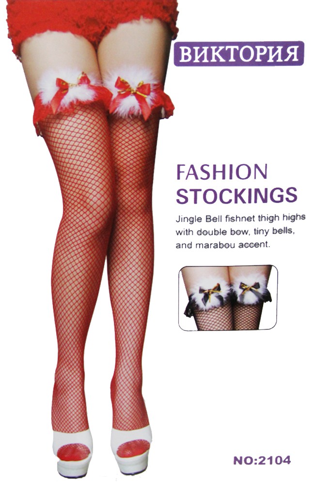 Чулки новогодние на резинке в мелкую сетку с бантами и бубенчиками.