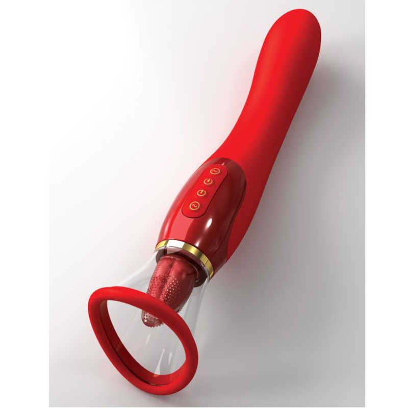 Люксовая версия великолепного двустороннего вибратора Fantasy For Her Her Ultimate Pleasure. Модель отличается наличием золотистой вставки в виде колечка и окраской насыщенного красного оттенка. Девайс способен реалистично имитировать ласки языком - его можно использовать для воздействия на клитор или соски груди. Одна из сторон модели представляет собой классический вибратор с изогнутой головкой, удобной для стимуляции точки G. Если игрушку развернуть, ствол становится рукояткой, а вторая сторона – вакуумным стимулятором. Внутри игрушки имеется встроенная помпа. Эластичная воронка из силикона позволяет создать область пониженного давления, вызывающего прилив крови к эрогенной зоне. Внутри находится небольшой эластичный язычок, покрытый пупырышками. Он вибрирует и щекочет нервные окончания, погружая даму в фантастический экстаз. Устройство поддерживает 10 режимов вибрации, 7 режимов работы эластичного язычка и 3 режима вакуум-стимуляции. Размеры 25 х 4 см. Для питания используется встроенный аккумулятор.