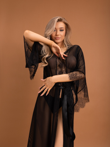 Этот длинный пеньюар создан для тех, кто желает выглядеть элегантно и изысканно. Этот наряд сделан из прозрачной сетки, что позволяет обнажить красивое женское тело, но в то же время не показывая его полностью. При этом, потрясающее тонкое французское кружево с ресничками, отделка края и низа, придают пеньюару особый шарм и изысканность.