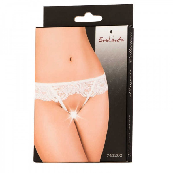 Белые эротические трусики кружевные, эластичные с открытым лобком в размере 42-44. Спереди декорированы атласным бантиком. Свободный кружевной край. Допускается замена кружева на аналогичное. Открытая интимная зона создана для свободного занятия сексом.