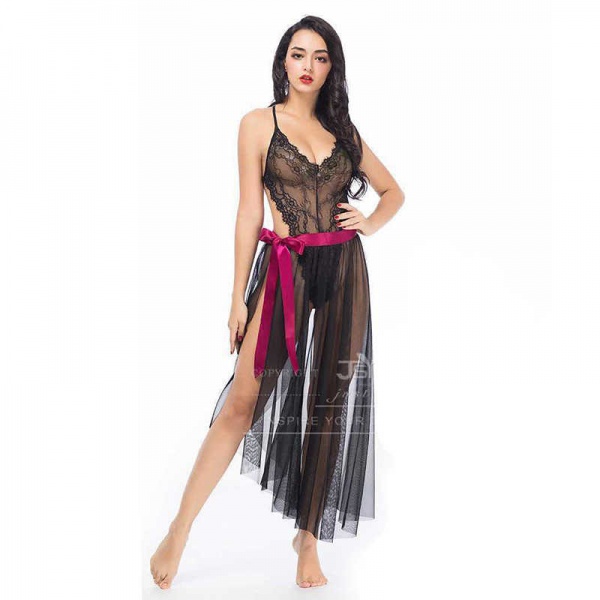 Очаровательное эротическое боди из нежной кружевной ткани изящно прикрывает женское тело, визуально подчеркивая линию талии. Бюст достаточно глубоко декольтирован, позволяя любоваться на ложбинку между грудей, а бока оставлены открытыми. Белье укомплектовано длинной юбкой из прозрачной тюлевой ткани, воздушным облаком облегающей ноги и фиксирующейся на талии при помощи бордовой атласной ленты. Состав материала 90% нейлона, 10% спандекса. Размер S/L.