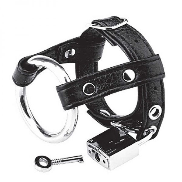 Аксессуар предназначен для одновременной стимуляции пениса и мошонки. Игрушка представляет собой конструкцию из кожаных ремешков, соединенных перемычками с металлическим кольцом диаметром 4 см. Кольцо одевается на пенис, а фиксирующий ремень заводится за мошонку, надежно застегиваясь в этом положении. В комплекте есть маленький навесной замочек с ключиком, который можно навесить в специальные проушины. Конструкция из черной экокожи эффектно декорирована никелированными клепками, которые дополнительно усиливают соединения.