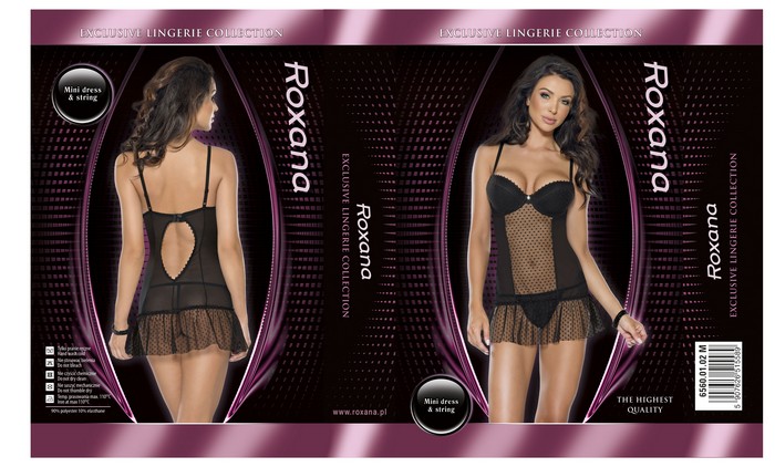 омбинация черная с вырезом на спине. Лиф, вставки по бокам, стринги из более плотного, не просвечивающего материала. Нижняя часть комбинации (''юбочка'') и центральная вставка спереди из просвечивающего материала с узором по типу '' в горошек''. Лиф украшен искусственным камнем. В комплект входят стринги.