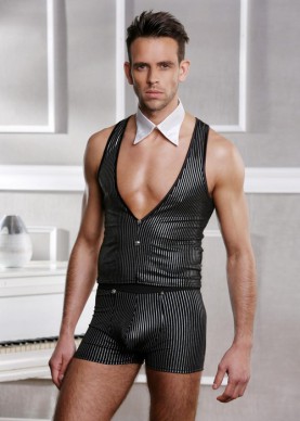 Этот элегантный ролевой костюм подчеркнёт природное обаяние мужчины, которое покоряет с первого взгляда. Ведь эластичная жилетка, трусы-шорты, украшенные серебристыми пуговицами, и воротник-галстук помогают создать не просто образ, а образ джентльмена, знающего толк в сексе высокого стиля.