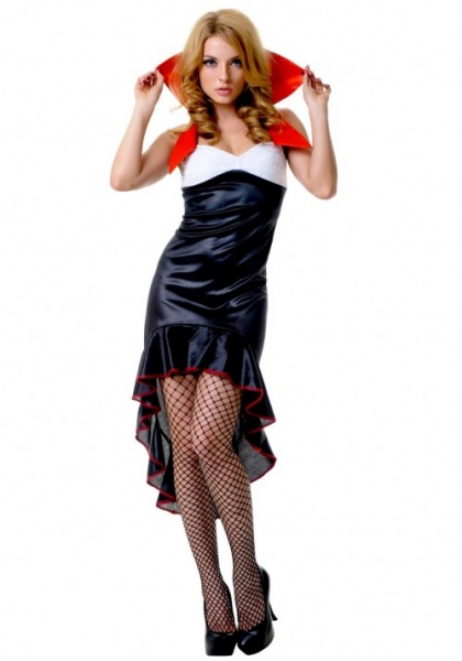 В этом костюме нашли отражения три самых главных цвета: черный, белый и красный. Изысканное черное платье украшает белый лиф и высокий красный воротник. Материал мерцает при свете, привлекая внимание к изящному женскому силуэту. Платье имеет разную длину: сзади оно доходит до середины икр, а спереди оголяет ноги до середины бедра. В таком наряде можно эффектно появиться на любое торжество. Даже, если по плану не будет маскарада, то в этом платье любая дама будет выглядеть, как женщина-вамп.Артикул 02490