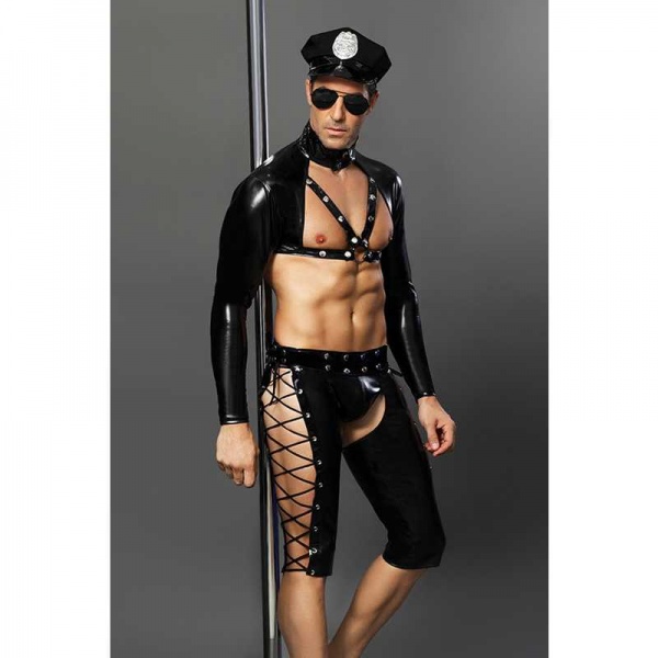 Костюм полицейского Candy Boy Josh, выполненный из ткани wetlook с лаковыми вставками и серебристыми кнопками – выбор смелых и очень уверенных в себе мужчин! Обтягивающий топ-рашгард c воротником-стойкой на кнопках подчеркивает рельеф мужского торса. Wetlook трусы–чапсы (современное прочтение ковбойской одежды) шнуруются по бокам, на бедрах фиксируются регулируемыми кнопками. Открывающийся вид сзади просто незабываем! Настоящие затемненные очки, головной убор с надписью «City Police» дополняют образ.