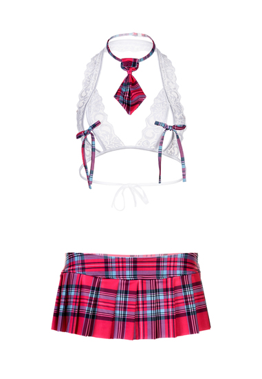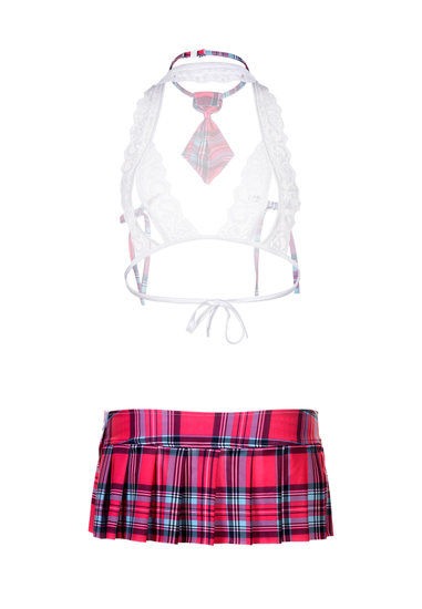 Открытый бюстгальтер с шаловливыми бантиками, юбочка и галстук. Упаковка: полноцветная коробка с еврослотом (высота: 27,75 см, ширина: 17,7 см, толщина: 2,5 см, высота еврослота: 3 см