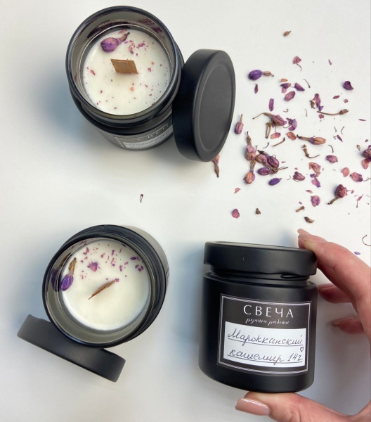 Натуральная ароматическая свеча изготовлена из 100% кокосового и соевого масла, масло ши, с деревянным фитилём который трещит, создавая эффект маленького камина.
