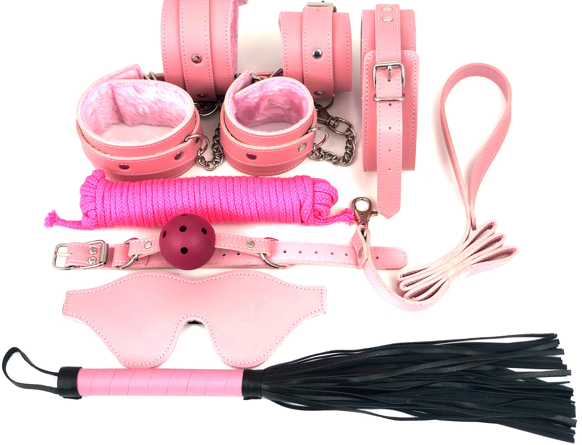 В набор входит абсолютно все, что может пригодиться для самой шикарной ночи в стиле БДСМ — наручники, оковы, кляп, плеть, закрытая маска на глаза, веревка для шибари, и даже ошейник с поводком!