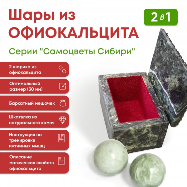 Набор из 2-х шариков из натурального камня Офиокальцита ,серии "Самоцветы Сибирии "в ларце из натурального камня .О магических и целебных свойствах камня Офиокальцит вы можите прочитать, перейдя по ссылке.В связи с тем, что каждый отдельно взятый образец природного камня уникален, размер и внешний вид товара может незначительно отличаться от изображения на сайте.Также,как форма и картинка на крышке ларца.