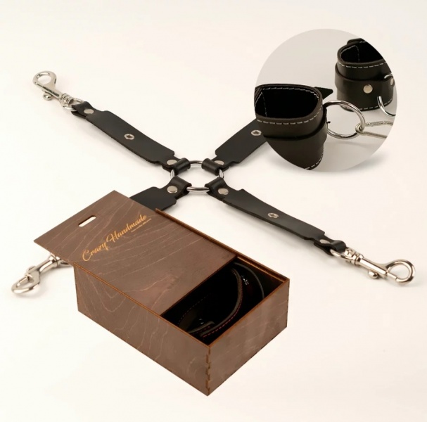Крестовина выполнена из натуральной кожи черного цвета с контрастной строчкой. Отличается безупречным качеством, оригинальным дизайном и атмосферностью. Наручники и оковы для фиксации идут в комплекте.