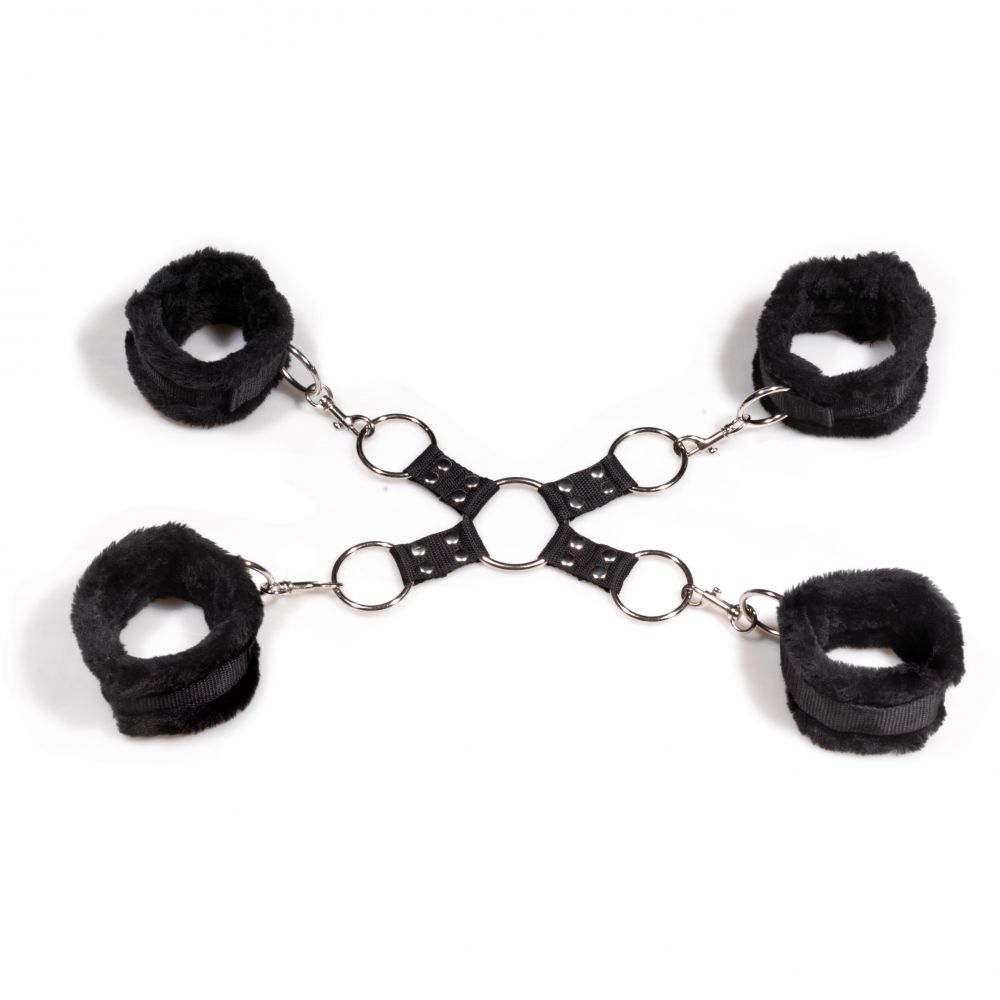 2 пары манжет, которые соединяются одним кольцом, дадут возможность полностью управлять вашим Нижним. К соединительному кольцу манжеты крепятся с помощью карабинов, поэтому, при желании, их можно легко отцепить.Манжеты изготовлены из нейлона с мехом. Ширина манжетов 6 см. Длина наручников - 40 см, наножников - 41 см.