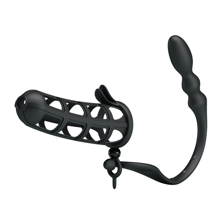 Закрытая силиконовая насадка на пенис и ребристый анальный стимулятор могут быть использованы как вместе, так и по отдельности.