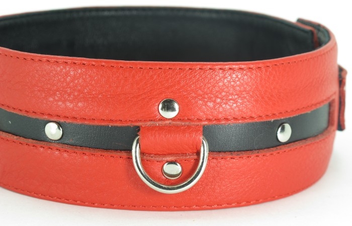 Ошейник с красным подкладом. Выполнен из толстой ременной кожи черного цвета, подклад мягкая перчаточная кожа ярко красного цвета. На пряжке. Использована усиленная металлическая фурнитура. Строчка толстой ниткой контрастного красного цвета.