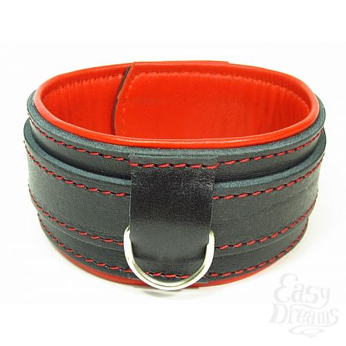 Ошейник с красным подкладом. Выполнен из толстой ременной кожи черного цвета, подклад мягкая перчаточная кожа ярко красного цвета. На пряжке. Использована усиленная металлическая фурнитура. Строчка толстой ниткой контрастного красного цвета.