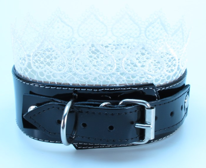 Ошейник с красным подкладом. Выполнен из толстой ременной кожи черного цвета, подклад мягкая перчаточная кожа ярко красного цвета. На пряжке. Использована усиленная металлическая фурнитура. Строчка толстой ниткой контрастного красного цвета.