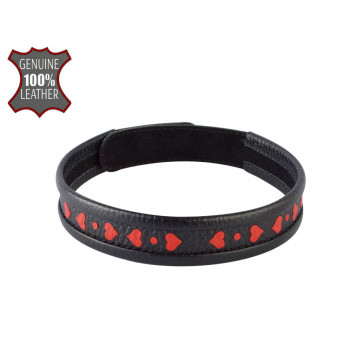 Изысканный ошейник, привнесёт в ролевые игры нотку романтизма, и обязательно привлечёт внимание к Вашей шее. Черный ошейник из натуральной кожи, с красными вставками в виде сердечек. На ошейнике имеется несколько кнопок, которые позволяют подогнать его под необходимый размер. Ширина ошейника 21 мм, длина 41 см, масса нетто 20 гр. Цвет черный.