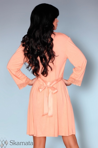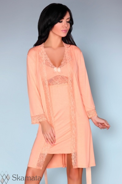 Нежный комплект из вискозы. Пеньюар и сорочка декорированы кружевом с цветочным рисунком, пояс из атласной ленты.