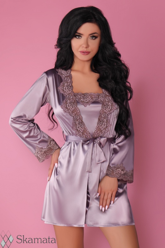 Элегантный комплект из искусственного шёлка, сорочка на тонких бретелях, пеньюар и трусики.