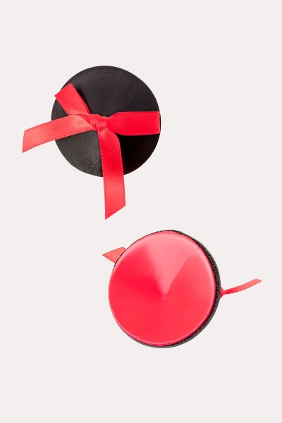 Наклейки на соски многоразовые. С контрастными бантиками. Конус выполнен из полиуретана, внутри — слой силиконового геля. Декор: искусственная кожа, сатиновые бантики.