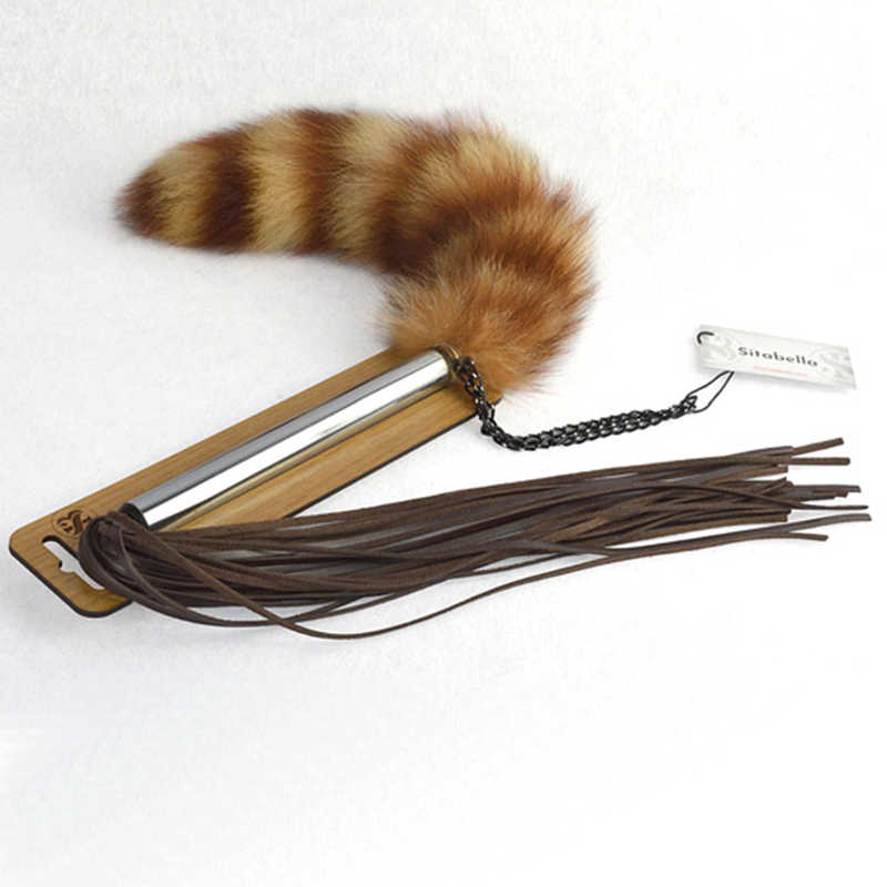 Стильная плетка с ударной частью, набранной из тонких кожаных ленточек. Натуральная кожа обладает превосходной износостойкостью и приятна наощупь. Модель декорирована роскошным натуральным хвостом длиной 25 см., расположенным в основании рукоятки. Хвостик свободно свисает вниз и может использоваться в роли щекоталки. Рукоять размером 15 х 1,6 см. сделана из металла и имеет цилиндрическую форму. Длина ударной части составляет 30 см