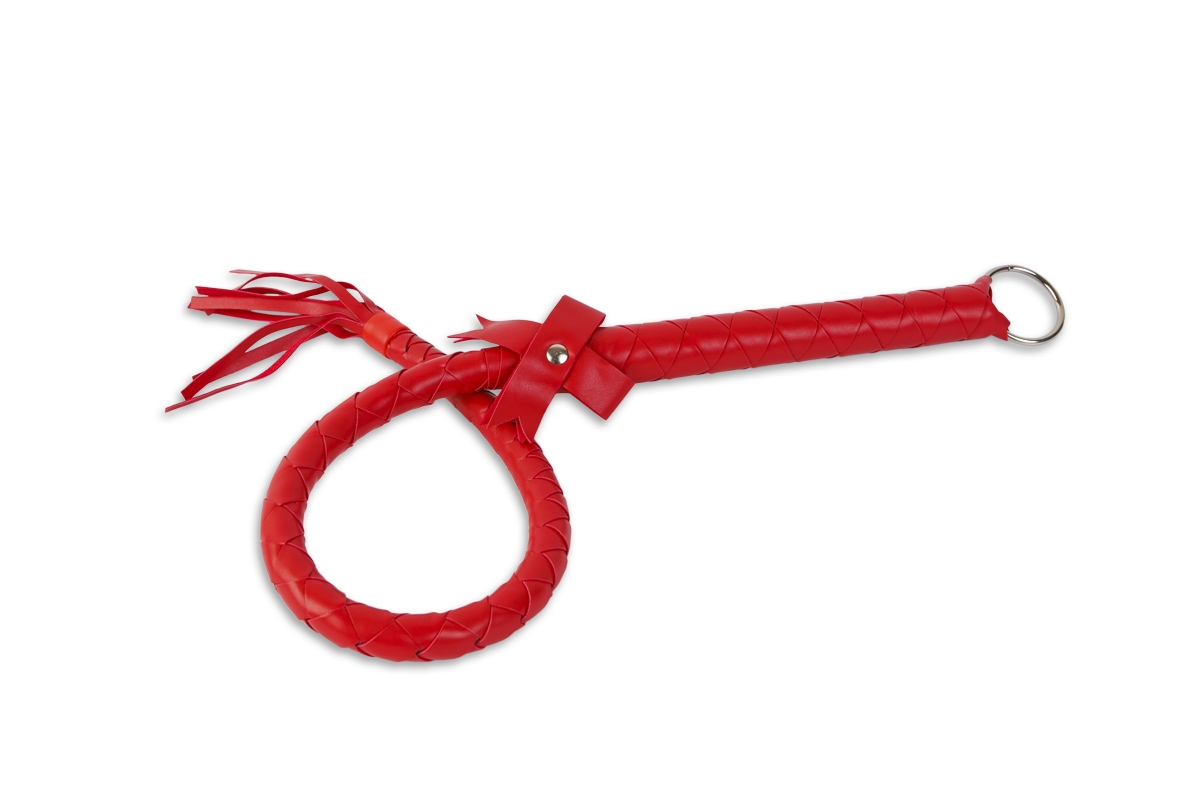 Хлыст средней длины изготовлен из кожзаменителя красного цвета. Ударный девайс выполнен в виде плётеной верёвки. Ударная часть соединяется с рукояткой рваным узлом. На рукоятке также есть металлическое колечко для крепления других атрибутов. |