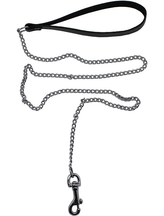 Классический поводок, состоящий из металлической цепи длиной 80 см, удобной ручки из натуральной кожи и карабина.