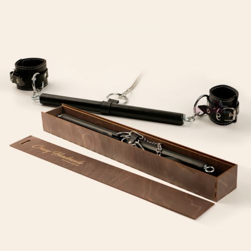 Распорка выполнена из дерева и обтянута натуральной кожей. Однослойные наручники также выполнены из натуральной кожи черного цвета и декорированы контрастной строчкой.