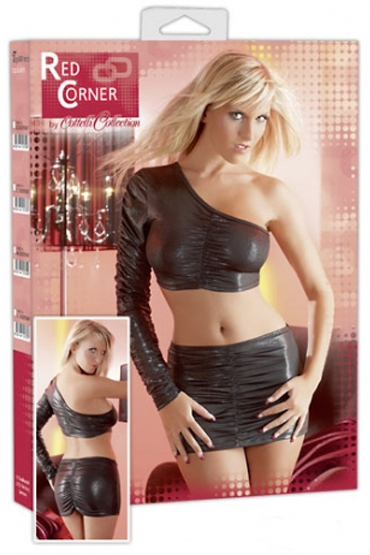 Топ с левой открытой рукой и мини-юбка. Юбка и топ украшены складками создающими текстурные линии для придания большей женственности.
