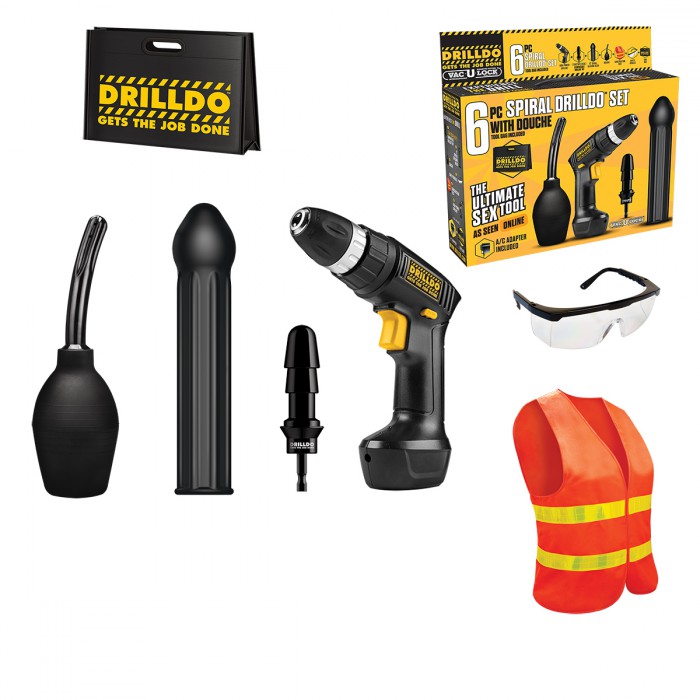 Мечта любителей хардкорного секса сбылась! Полный набор для настоящего анального секса в отличном исполнении от DRILLDO. Большой набор из 7 предметов. Секс-шуроповерт, переходник для насадок Vac-U-Lock, ребристый 8-дюймовый член, анальный душ, жилет со светоотражающими полосками, защитные очки, фирменный чехол. А теперь о каждом предмете отдельно. Секс-шуроповерт заряжается от сети, поставляется с маленькими зарядом батареи, поэтому рекомендуется перед первым применением заряжать его около 5 часов. Для полного заряда в последствии потребуется 3-5 часов. Когда девайс будет полностью заряжен, на нем погаснет световой индикатор заряда. Имеет регулировку интенсивности вращения, осуществляет 300 оборотов в минуту без вставленного бита. Стальная битка (адаптер) в форме штыря Vac-U-Lock позволит использовать любые насадки, подходящие для этого разъема. Анальная клизма с мягким резервуарам для воды и гибкой тонкой трубкой с желобками. Длина трубки 12 см, диаметр 1,5 см. Силиконовый большой анальный фаллос с рельефным