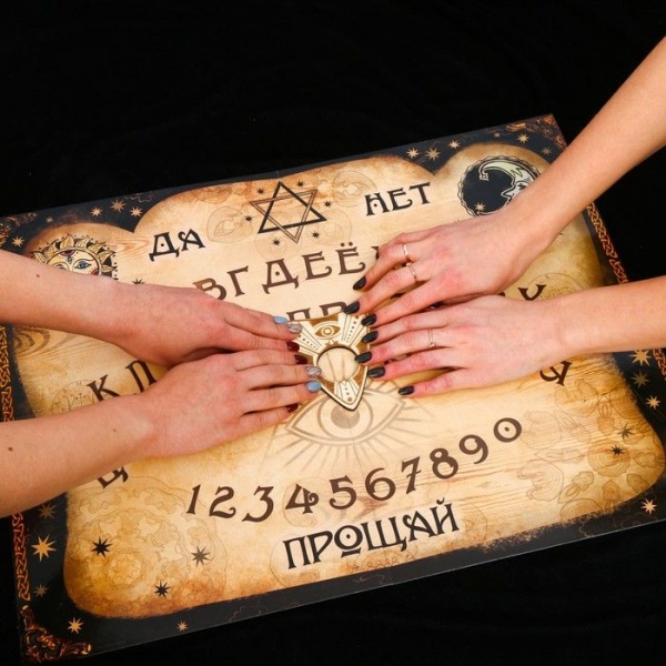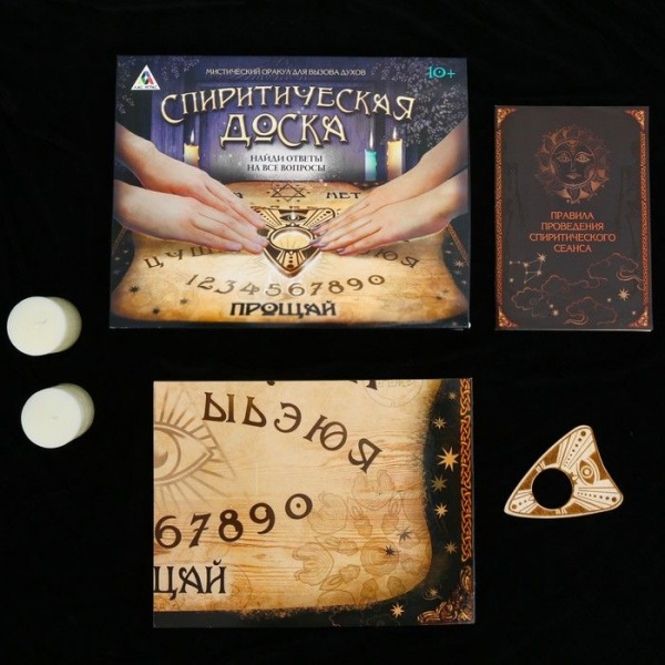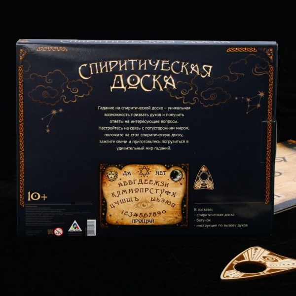 Внутри вы найдёте: спиритическую доску, бегунок, инструкцию. Получите ответы на все вопросы!