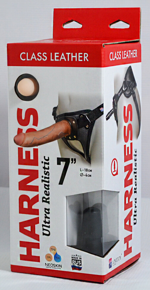 Комплект из трусиков с насадкой. Трусики изготовлены из кожи, комфортные и мягкие, удобно регулируются до необходимого размера. Насадка в виде члена, изготовленная из "кибер-кожи", имеет ярко выраженную головку и прорисованные вены. Общий кразмер насадки - 18 см, диаметр - 4 см.