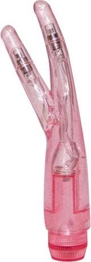 Двойной розовый вибратор для двойного удовольствия! В каждом из двух «пальцев» этого вибратора находится мощный вибромотор: для одновременной стимуляции клитора и влагалища или влагалища и ануса. Конечно, вы также можете использовать оба пальца одновременно на одном интимном месте. Другими словами, вы можете наслаждаться этим вибратором несколькими способами!Особенности: - Общая длина: 17,5 см - Диаметр: 1-3 см - Материал: ПВХ - Цвет: розовый прозрачный - Питание: 2 батарейки ААА (эксклюзивно) -