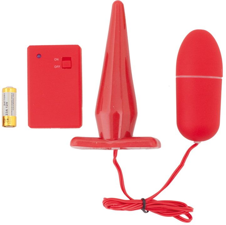 Вибронабор состоит из классической анальной втулки, виброяйца и пульта дистанционного управления. Втулка изготовлена из гибкого TPE (термопластный эластомер), виброяйцо и пульт ДУ- из высококачественного пластика с бархатистым напылением красного цвета. Вибронабор может использоваться для одновременной анально- клиторальной или анально- вагинальной стимуляции.